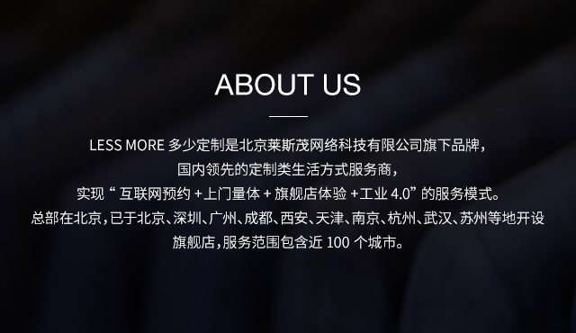 LESS MORE多少定制 2015年5月創(chuàng)立于北京,以互聯(lián)網(wǎng)思維和工業(yè)4.0切入服裝定制領(lǐng)域,獨創(chuàng)“互聯(lián)網(wǎng)預(yù)約+旗艦店體驗+免費上門量體+工業(yè)4.0 C2M生產(chǎn)”的模式,現(xiàn)已成為國內(nèi)服裝定制行業(yè)的標(biāo)桿品牌。